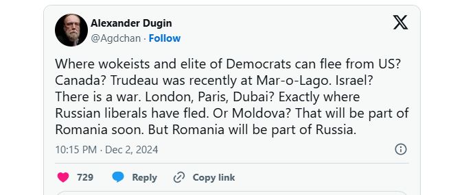 Alexandr Dughin, cunoscut drept ideologul lui Vladimir Putin, a publicat un mesaj pe rețeaua de socializare X, în care afirmă că România va deveni parte a Rusiei în curând. Acesta a menționat, de asemenea, opțiunile pentru personalitățile „woke” sau elitele democraților din SUA, întrebându-se unde ar putea acestea să fugă. Dughin a enumerat diverse locații precum Canada, Israel, Londra, Paris și Dubai, sugerând că Moldova va fi parte a României în viitorul apropiat, dar a subliniat că România va fi sub influența Rusiei.