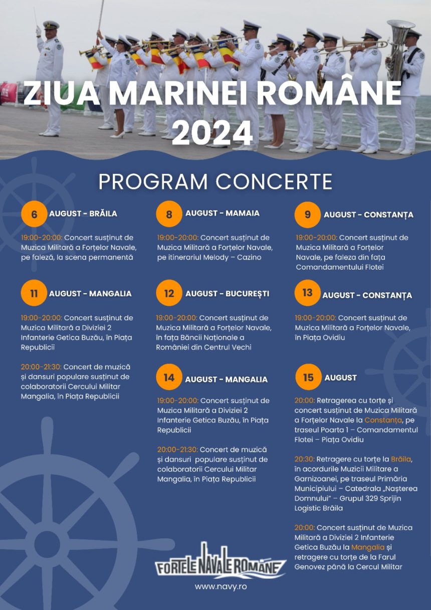 În perioada 6-15 august 2024, Muzica Militară a Forțelor Navale va susține o serie de concerte în diverse locații, inclusiv Brăila, Mamaia, Constanța, București și Mangalia, cu ocazia Zilei Marinei Române.